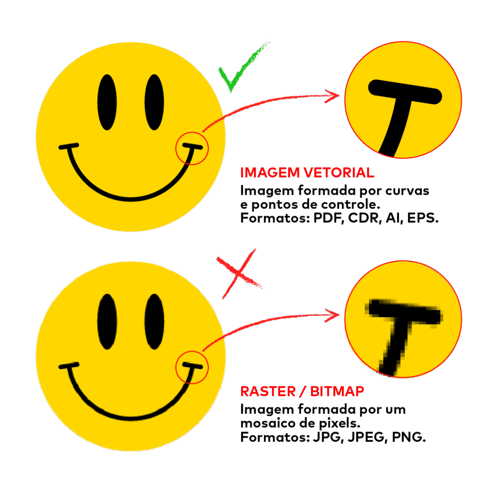 Imagens em raster (JPG, JPEG ou PNG) são formadas por pixels, o que causa serrilhamento e perda de definição na impressão. Sempre que possível, converta ou redesenhe seu arquivo em formato vetorial antes de enviar.